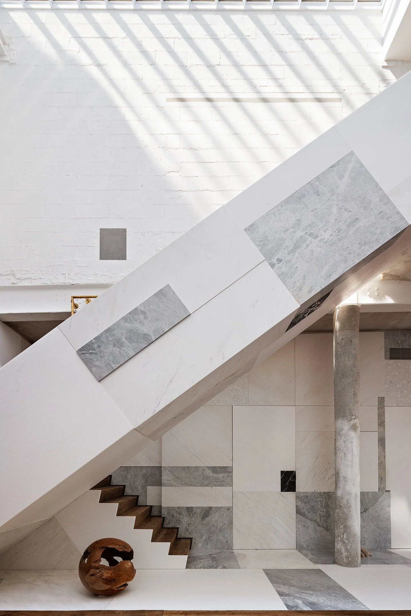 Rejecting the sterile uniformity of Manhattan’s luxury condos, the residence embraces imperfection and contrast. Marble slabs, each unique in shape, tone, and finish, defy the rigid Cartesian grid, creating a living sculpture where complexity transforms into tranquility. Reclaimed wood, cinderblock, and stone are set in dialogue with refined finishes, celebrating contradiction rather than concealing it.